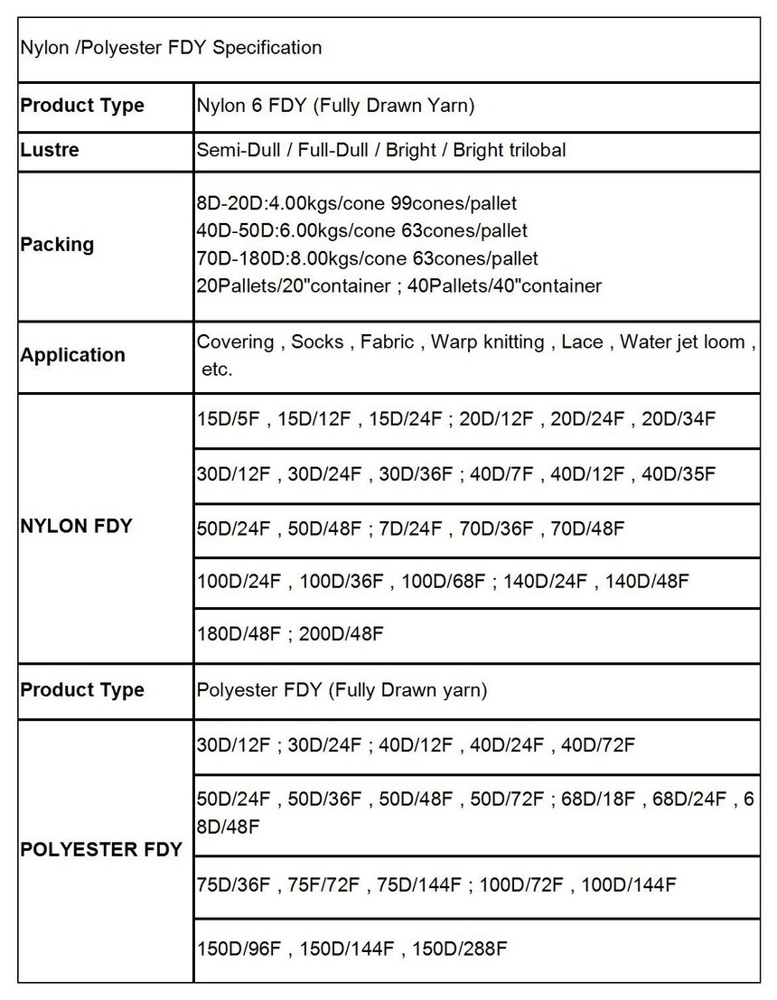FDY in nylon fully drawn yarn, it is also known as fully oriented nylon yarn. It is made by one step of spinning and stretching, so it has stable physical performance. It has lower breaking elongation and higher strength. Elongation is about 44-49%; strength>4.2Cn/dtex. Application: FDY is mainly used in warp knitting machine, circular knitting machine, water jet loom, rapier loom, and other knitted machines and knitting machines. It is suitable fields such as garment fabric, sportswear, high-grade garment lining, underwear, swimsuit, braid, high-grade industrial fabric, military product, etc. It can also be used for deep processing, such as textured yarn, air covered yarn and twist yarn, etc. Color retaining, high tenacity good yarn evenness and no broken wires.
